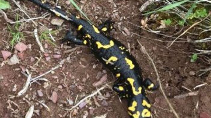 Evinin bahçesinde sarı ve siyah renklerden oluşan Türk semenderini gören vatandaş, fotoğrafını çektikten sonra doğaya bıraktı.