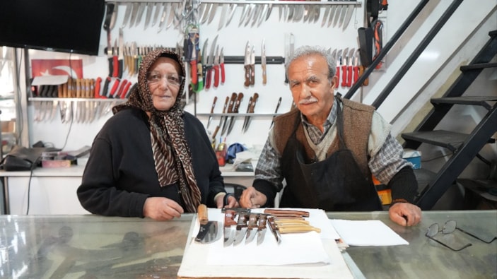 El emeği bıçak üretiminin son temsilcilerinden olan İhsan Binay’a işlerinde yardımcı olan eşi Meliha Binay ise, “Elimden geldiği kadar destek oluyorum. Beraber dükkanı açıyoruz, beraber kapatıp evimize gidiyoruz. Bu sanatı sürdürecek kimse kalmadı. Çırak bulamıyor, ben de gücüm yettiği kadar destek oluyorum” ifadelerini kullandı.