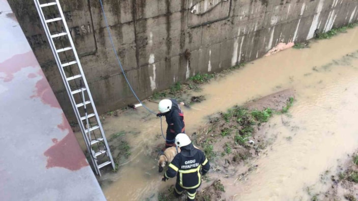 Ünye ilçesinde dereye düşen köpeğin sesini duyanlar ihbarda bulundu. Ekipleri merdivenle indiği deredeki köpeği çıkardı.