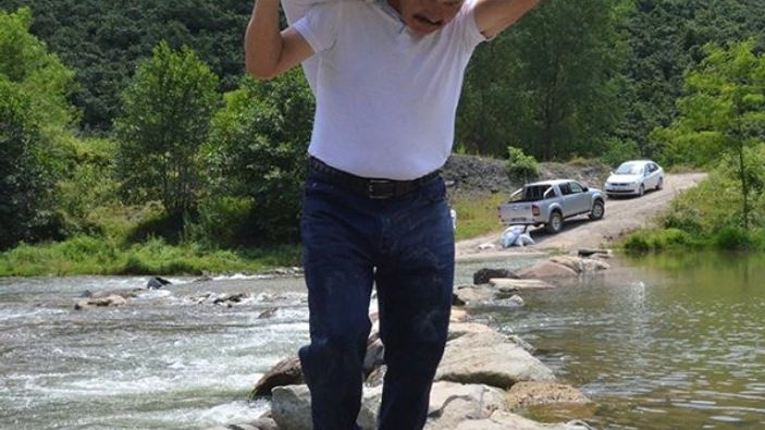 Yolu olmayan evine ulaşmak için ırmağa kayalıklardan yol yapan adam, sular yükseldiğinde evde mahsur kalıyor.