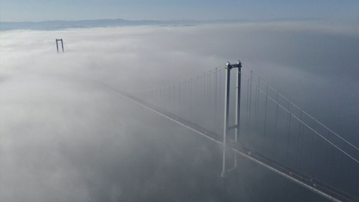Bölgede etkili olan sisin içinde kalan Osmangazi Köprüsü, etkileyici bir manzaraya büründü.