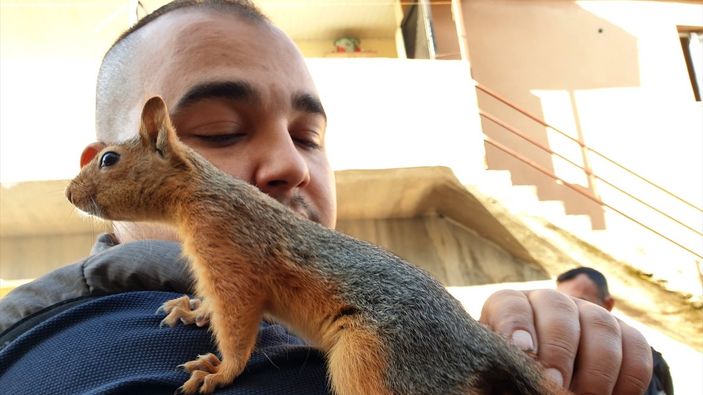Osmaniye'nin Dere Mahallesi'nde çiçekçi dükkanı işleten Sinan Biçer'in arkadaşı, 5 ay önce kestiği bir ağacın kovuğunda yavru bir sincap buldu.