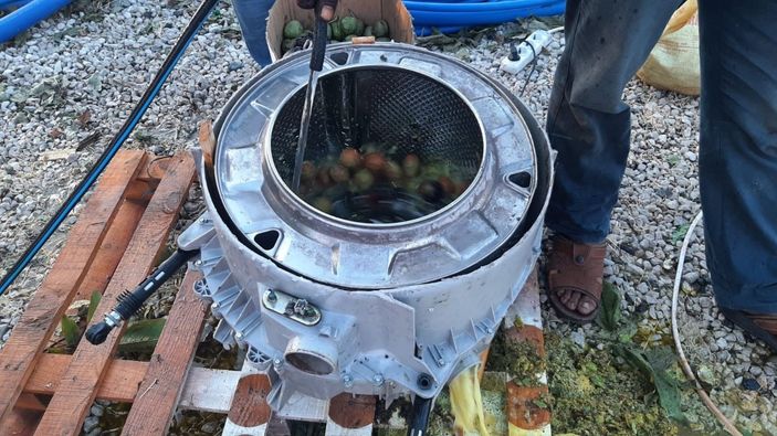 Üç arkadaş topladıkları cevizlerin kabuğunu soymakta zorluk çekince, çamaşır makinesinden ceviz kabuğu soyma makinesi yaptı. Bu sayede 2 saatte kabuğundan soyulan 5 kilogram ceviz, 3 dakikada bitiyor.