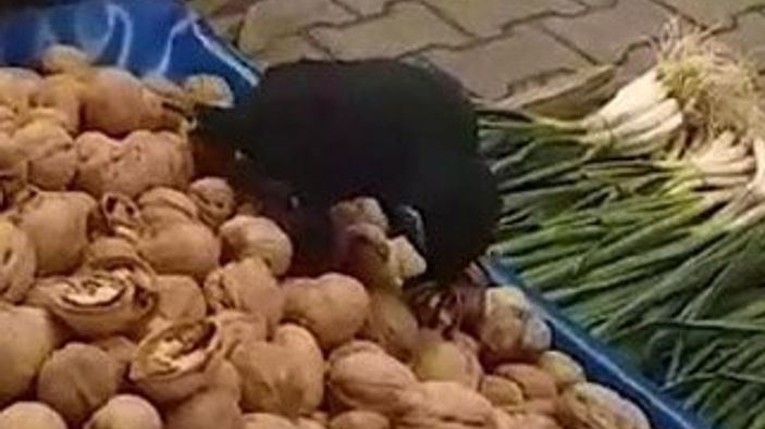 Pazar tezgahındaki cevizlere dadanan karga