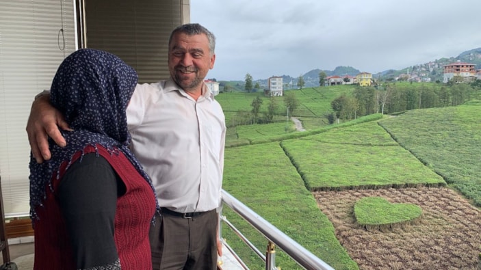 Kalkandere ilçesinde çay üreticisi Osman Öztürk, budama yaptığı bahçesinin ortasında kalp şeklindeki bir alanı bırakıp 28 yıllık eşi Meryem Öztürk’e sürpriz yaptı. Kalpli budama fotoğrafı, sosyal medyada beğeni toplarken, takipçiler Öztürk için ‘Çay love you’ yorumunda bulundu.