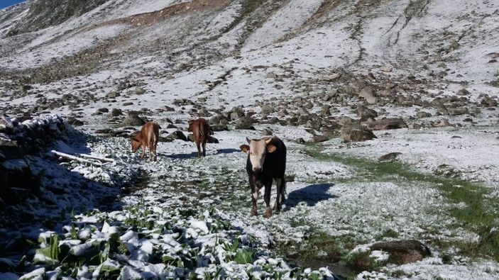 Rize’nin Çamlıhemşin ilçesinin deniz seviyesinden 2 bin 300 metre yükseklikteki Kavron Yaylası'nda yaşayanlar da kar sürprizi ile karşılaştı. Yaz ayında kar sürprizi yaşayanlar, o anları cep telefonları ile kayda aldı.
