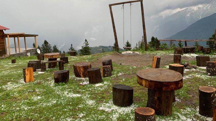 Çamlıhemşin ilçesindeki 1850 rakımlı Badara Yaylası'nda sağanak sonrası dolu yağdı. Kısa süreli etkili olan dolu ile birlikte ortalık beyaza büründü.