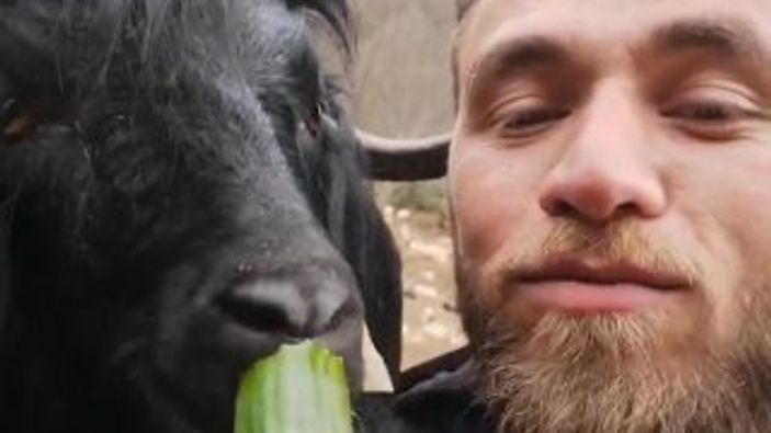 Rizeli bir gencin keçisi ile yaptığı ekmek kavgası görüntülerinin ardından bir başka gencin, keçileriyle yediği armut ve salatalığı bölüşmesi beğeni topladı.