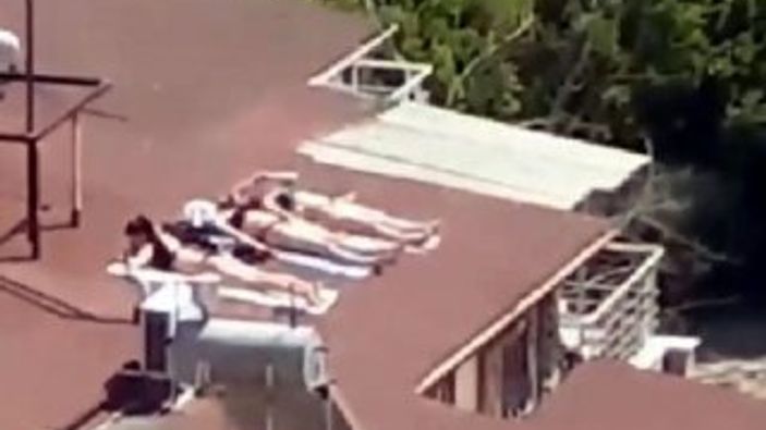 Antalya'nın Muratpaşa ilçesi Lara bölgesinde yüksek katlı bir binanın çatısına çıkan 3 kadın, bikinileri ve mayolarıyla saatlerce güneşlendi.