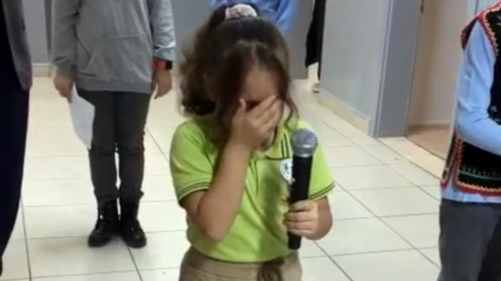 ‘Atatürk’ isimli şiiri okuyan 2’nci sınıf öğrencisi Sümeyye Önal ise şiiri okuduğu esnada gözyaşlarını tutamadı. Minik Sümeyye’nin gözü yaşlı şekilde şiiri okuduğu anlar, cep telefonu kamerasıyla saniye saniye kaydedildi.