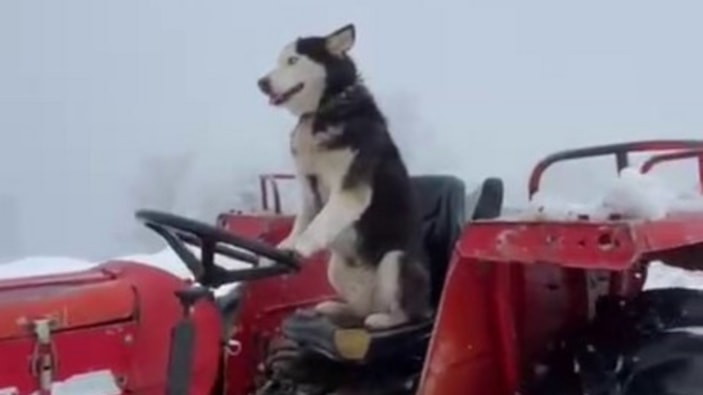 Karda metrelerce traktör kullandıran sahibi, o anları cep telefonuyla kaydederek, kar üzerindeki traktörün direksiyonunda köpeğin olduğu görüntüleri paylaştı.