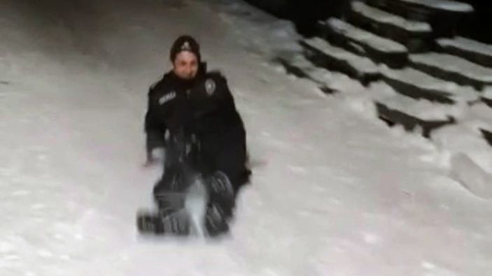 Bölgeye giden bekçiler, küçük çocukların keyfini bozmayarak onlarla birlikte kayak yaptı.