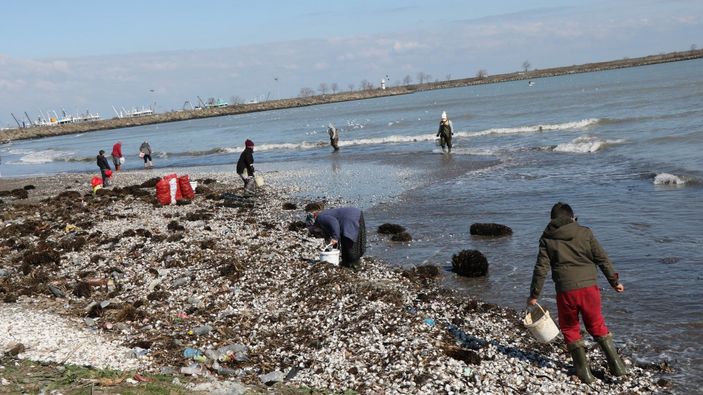 Etkili olan kar yağışının ardından çıkan fırtına, denizdeki salyangozları kıyıya attı. 5 yıl sonra kıyıya vuran salyangozlar, kadınlara ekmek kapısı oldu.