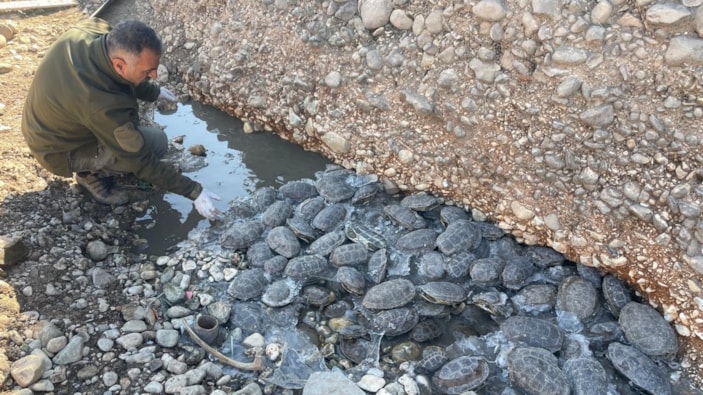 Şanlıurfa'da ıslah çalışmaları nedeniyle suyu kesilen dere yatağında mahsur kalan 316 kaplumbağa kurtarıldı.