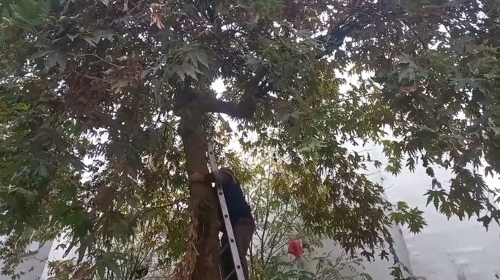 Tırmandığı ağaçtan geri inemeyen ve ulaşılamayacak noktada duran kedi, düşürülerek kurtarıldı.