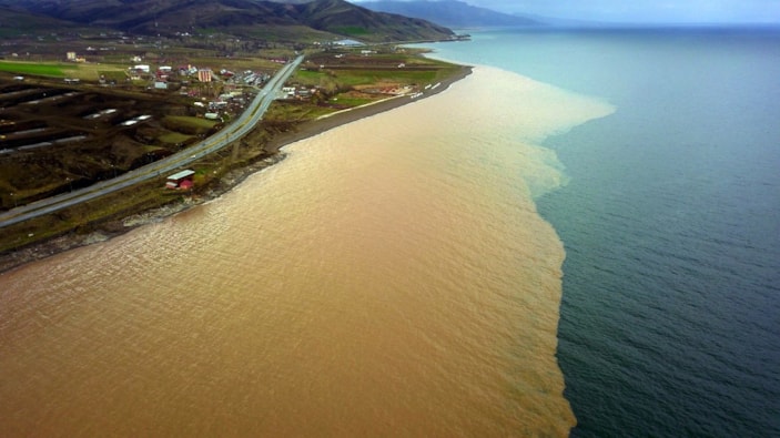 Bitlis’in Ahlat ilçesinde sel sonrası dere yataklarından dökülen suların Van Gölü üzerinde oluşturduğu görüntü havadan görüntülendi.