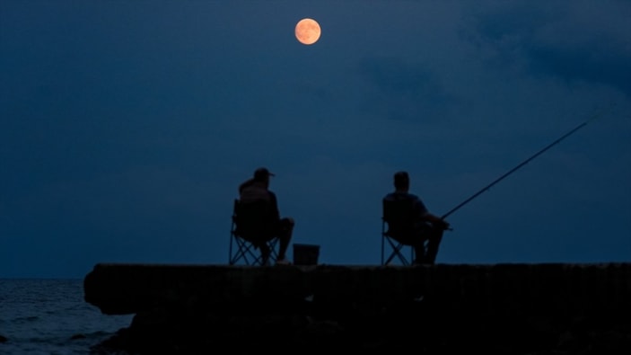 Sinop'ta sahilde bulunan balıkçılarla birlikte ay manzarası güzel görüntüler oluşturdu. Kentteki manzara, masalları anımsattı.