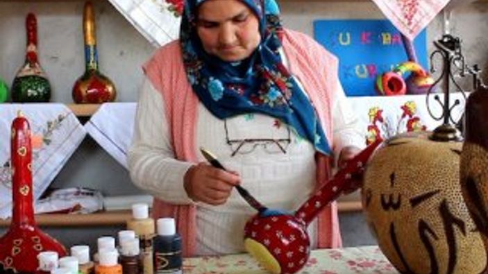 Kadınlar, kursta öğrendikleri su kabağı işlemeciliğiyle hem sosyalleşiyor hem de aile bütçesine katkı sağlıyor.