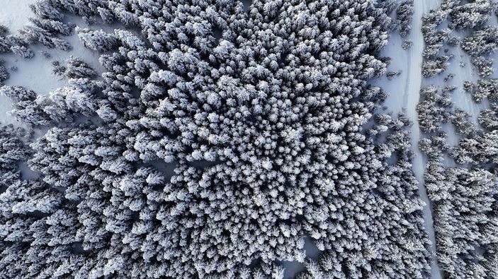 Kar yağışının ardından kristalize olan ağaç dalları ve bembeyaz örtüyle kaplanan dik yamaçlar, havadan çekilen görüntülerle bölgenin doğal güzelliğini bir kez daha kanıtladı.