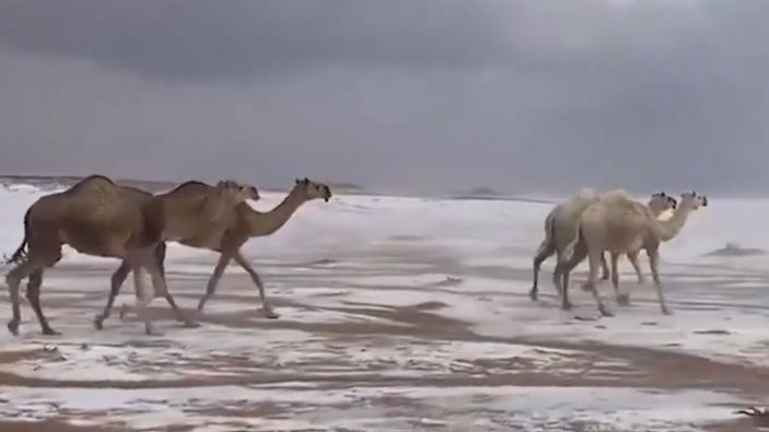 Suudi Arabistan'da yağan kar sonrası beyaza bürünen çölde koşan develer İZLE