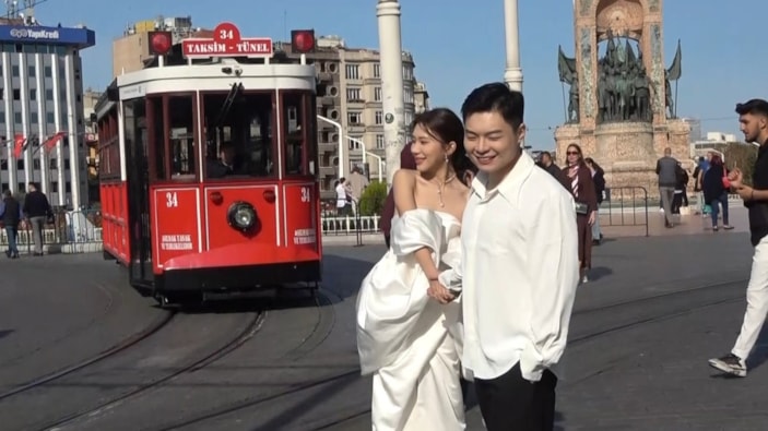 Yerli ve yabancı turistlerin uğrak noktası olan Taksim Meydanı, bu sefer Çinli gelin ve damadı ağırladı. Çin’den evlenmek için İstanbul’a gelen çift, fotoğraf çekimi için Taksim Meydanı ve İstiklal Caddesi'ni tercih etti.