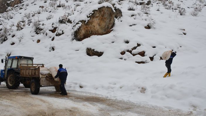 İlçenin farklı bölgelerine kulübe ve barınaklar yaparak sokak hayvanlarını besleyen belediye ekipleri, aynı zamanda dağlara tırmanıp hayvan yoğunluğunun olduğu bölgelere yem bırakıyor.