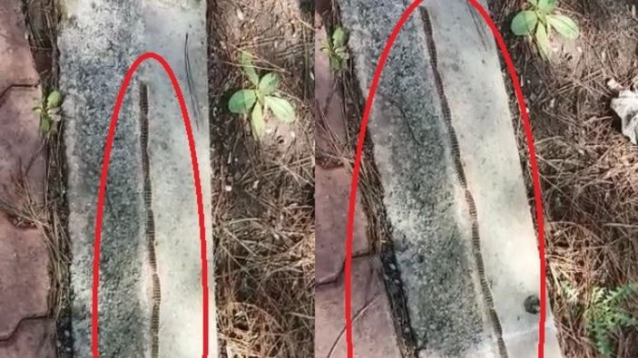 Yaşam alanlarına ilerlemek üzere sıralı dizilen tırtıllar, ilk bakışta yılan görünümü vererek görenleri korkuttu.