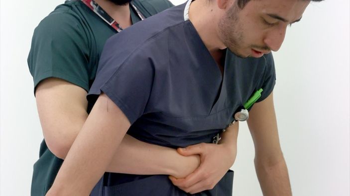 "Kişi öksürükle yabancı cismi atmayı başarabilir ama bu cismi atamıyorsa kişide tam tıkanıklık oluşabilir. O yüzden kişiye hızlıca müdahale edilmesi gerekir. Öncelikle kişinin sırtına, iki kürek kemiğinin ortasına beş kez elimizin ayasıyla hızlı şekilde yukarı doğru süpürme hareketiyle vurarak yabancı cismin çıkmasını sağlamamız gerekiyor. Eğer bununla yabancı cismi çıkarmayı başaramazsak Heimlich manevrasını yapmamız gerekir."