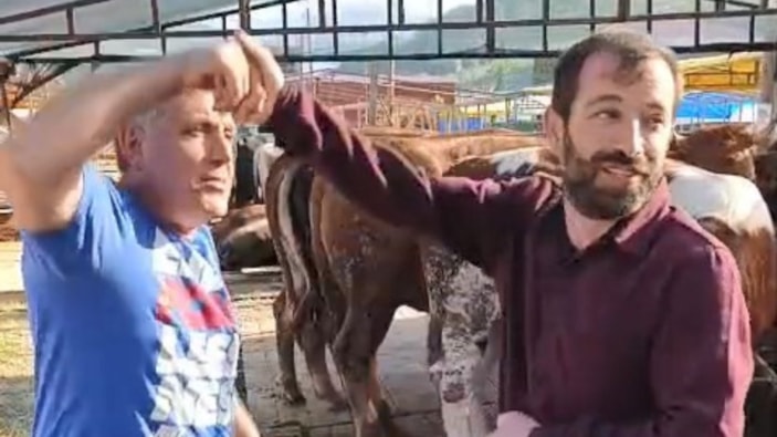 Trabzon'da almak istediği kurbanlık için yöreye özgü şivesinde "Alacam oni, beni kıramazsın" diyen vatandaş, satıcının kolunu sertçe salladı. Çevredekilerin "Adamın kolunu çıkardın" diye sitemde bulunduğu anlar kameraya yansıdı.
