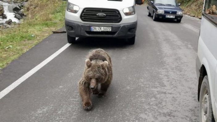 Kayıtlarda, ayının yolda seyreden araçlara aldırış etmeden yoluna devam ettiği, arkadan gelen başka bir minibüsün durarak ayının geçmesini beklediği görülüyor.