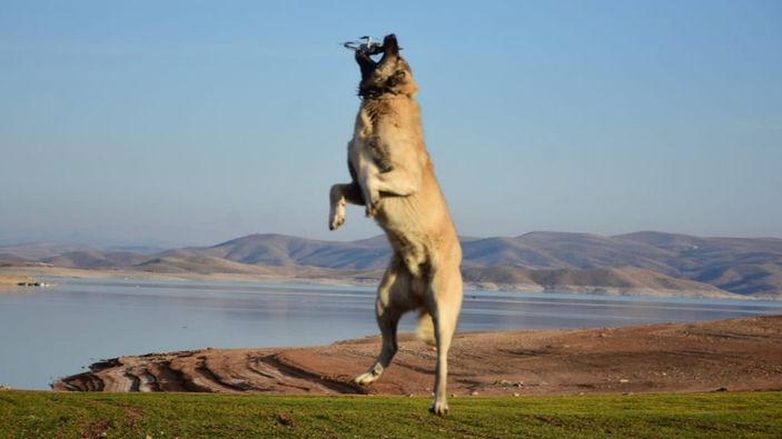 Koyun sürüsünü çekmek için yükselen drone'un yaklaştığını gören Kangal, koşarak 5 metre yükseklikteki drone'u kaptı. Köpek, daha sonra drone'u bırakıp uzaklaştı.