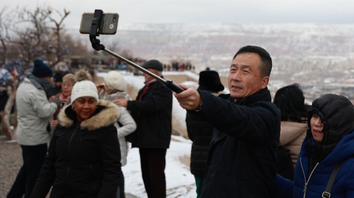 Kapadokya'ya gelen turistler, karla kaplı bölgeyi gezerek fotoğraf çekti.