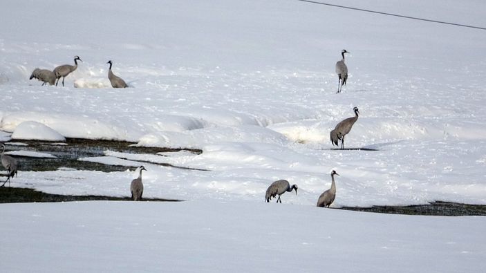 Hakkari'nin Yüksekova ilçesinin ‘Kuş Cenneti’ olarak bilinen Nehil Sazlığı, onlarca kuş türüne ev sahipliği yaparken, göç yoluyla kuşlar gelmeye başladı. Her sene olduğu gibi yine göç yoluyla gelen onlarca kuş türünden biri olan turna, ovada bulunan kar üzerinde sürü halinde görüntülendi.