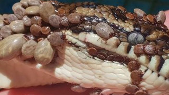 "Şüphesiz ki yılan inanılmaz derecede rahatsız durumdaydı" diyen Harrison, "Yılanın bütün suratı şiş ve benek benekti. Tüm suratı kanını emmekten ötürü oldukça büyümüş halde ola kenelerle kaplıydı" ifadelerini kullandı.