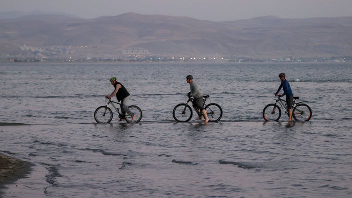 Van Gölü'nde oluşan adacıklarda bisiklet sürdüler