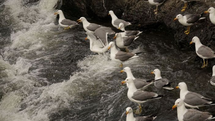 Üremek için yoğun çaba sarf eden balıklar, uçarcasına suyun akışının tersine yüzüyor. Yoğun üreme göçüne sayılı günler kalırken, martılar da bölgeye gelmeye başladı.