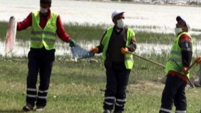 Çöp toplama çalışmalarının bitmesinin ardından ekipler, ellerindeki kürek ve süpürge saplarıyla sosyal mesafe kuralarına dikkat ederek, bir süre halay çekti. Toplanan çöpler ise kamyonlara yüklenerek, çöp toplama merkezine götürüldü.