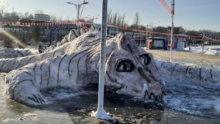 Edremit ilçesindeki Kent Meydanı'nda biriken karları temizleyen işçiler, 10 metre uzunluğunda dev "Van Gölü canavarı" yaptı.