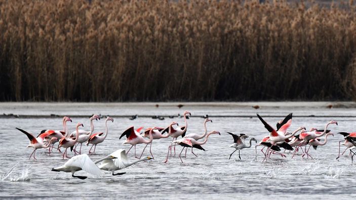 Rusya'nın Sibirya bölgesinden göç eden beyaz ötücü kuğular ile yaz aylarında Van'a gelen flamingolar, Van Gölü sahilinde bulunan Gevaş'ın Göründü sazlığında görsel şölen sunuyor.