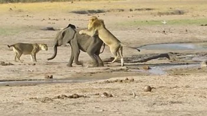 Zimbabve'nin Hwange Milli Parkı'nda hayvanlar aleminin en güçlü hayvanları, yavru fili av olarak gözüne kestirdi.