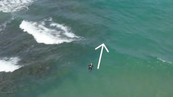 Akıntıda yaklaşık 100 metre sürüklenen Ünal, panik yapmadan sakinliğini koruyup, yüzerek kapıldığı akıntıdan çıktı. O anlar drone'la görüntülendi.