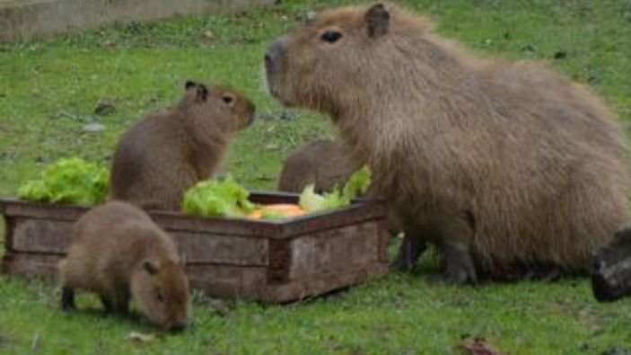Annelerinin yanından bir an bile ayrılmayan kapibaralar marul, ot, çimen ve fundalık ile besleniyor.