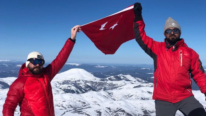 Ekip, yaklaşık 2 saat süren tırmanışın ardından zirveye ulaştı. Dondurucu soğuğa karşı koyan ekip, dağın zirvesinde şiddetli rüzgar ve tipi nedeniyle karla kaplanan ve yıpranan Türk bayrağını yenisiyle değiştirdi.
