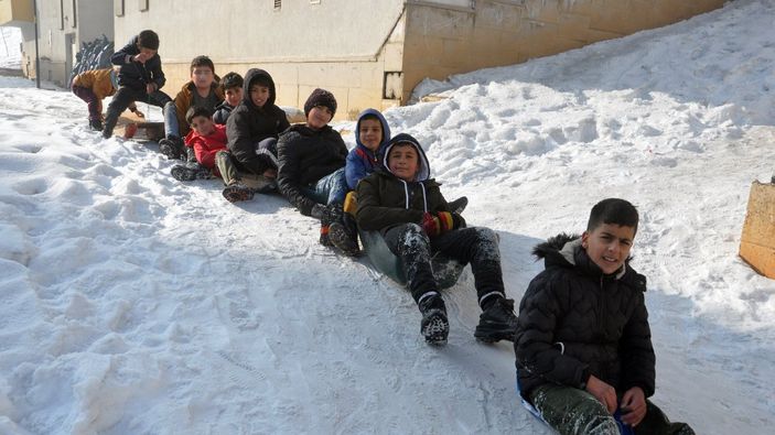 Neşeyle kayan çocuklar, "Arkadaşlarla birlikte temin ettiğimiz poşet, tepsi ve tahtalarla kayarak güzel vakit geçiriyoruz. Derslerimizi de ihmal etmiyoruz." dediler.
