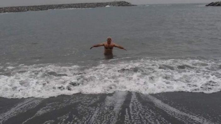 Zonguldak'ta "Buz Adam" lakaplı Atanur Öner, 7 derece sıcaklıkta denize girerek buz gibi havaya meydan okudu.