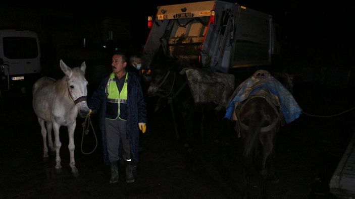 Temizlik görevlileri, katırlarla birlikte gece yarısından sabah 07.00'a kadar Meşrutiyet, Mithatpaşa, Tepebaşı, On Temmuz, Karaelmas ve Terakki mahallelerinde yaklaşık 30 ton çöp topluyor.