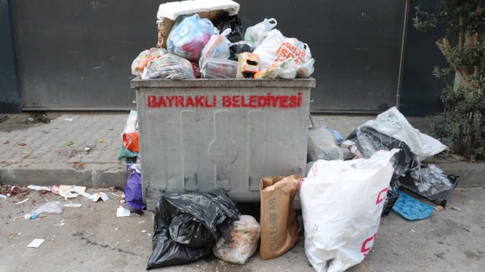 İzmir'in Bayraklı ilçesinde toplu iş sözleşmesinde anlaşmaya varılamayınca işçiler, grev kararı aldı. Grev kararının ardından ilçenin sokaklarında çöplerin yola taştığı görüldü.