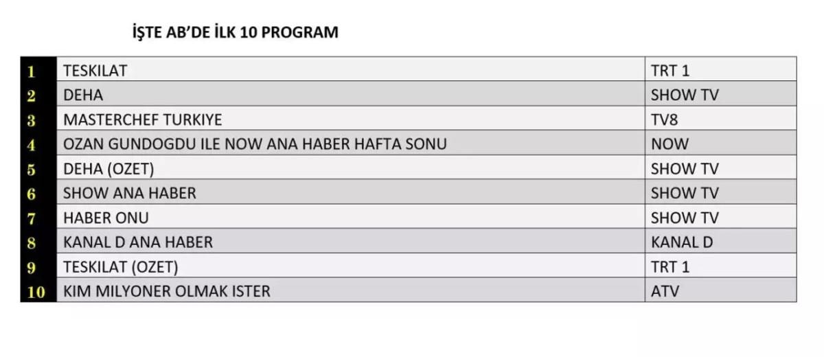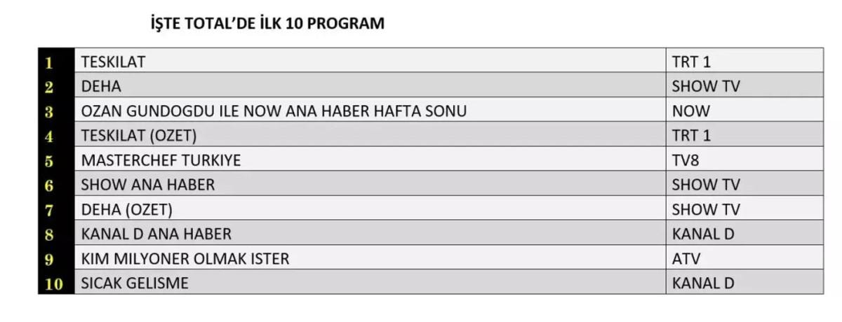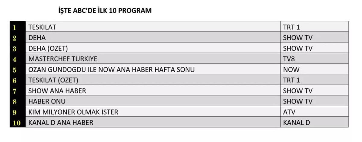 Her gün bir önceki güne ait Total, AB ve ABC sıralaması belli olurken dünün reyting sonuçları merakla bekleniyor.