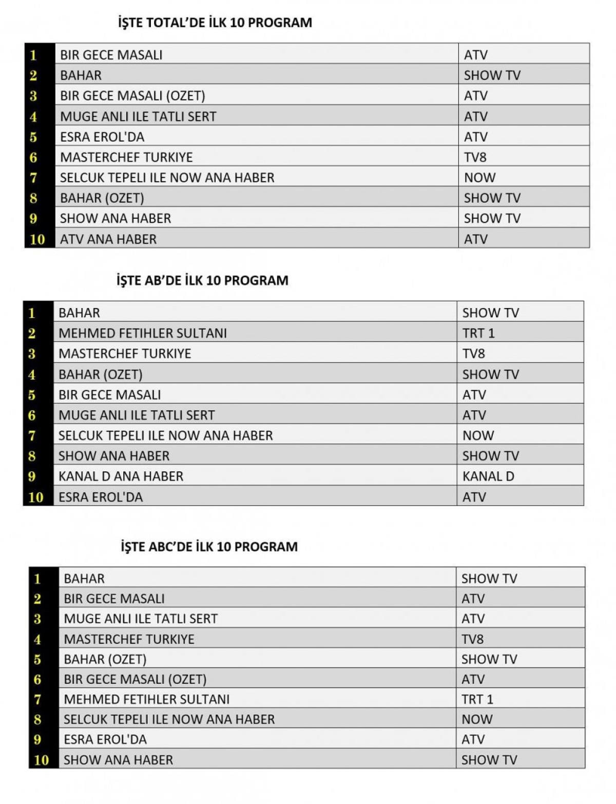 ABC'de ise 1.sırada “Bahar”, 2.sırada “Bir Gece Masalı”, 3.sırada Atv’de ekrana gelen “Müge Anlı İle Tatlı Sert” yer aldı.