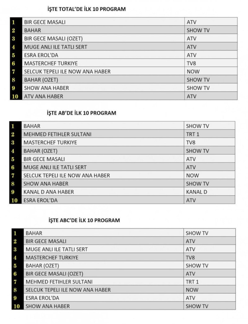 Her gün bir önceki güne ait Total, AB ve ABC sıralaması belli olurken dünün reyting sonuçları merakla bekleniyor.